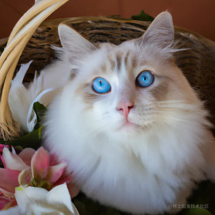 一只毛茸茸的蓝眼睛白猫坐在花篮里,可爱地抬头看着镜头