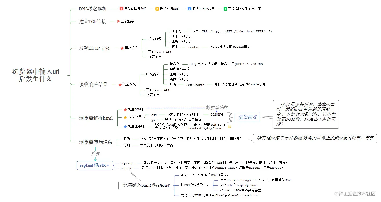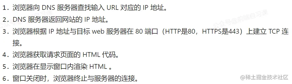 DNS域名解析=>建立TCP连接=>发起HTTP请求=>接受响应结果=>浏览器解析html=>浏览器布局渲染