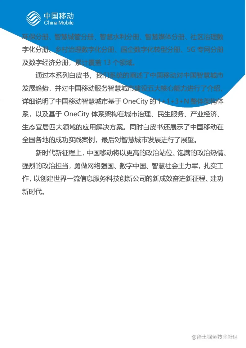 中国移动秉承“树立新理念、采用新技术、打造新平台、丰富新应用、构建新生态”理念,通过打造“咨询-设计-交付一体化”的新型服务模式,在城市治理、民生服务、产业经济、生态宜居四大领域全面发力,全力打造新型智慧城市运营商,推进城市信息化向新型智慧城市发展,助力城市治理更加科学高效、人们生活更加智能便捷,促进我国经济社会高质量发展。
