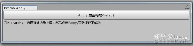EditorGuILayout.LabelField("在 Hierarchy 中选择特效的最上级,然后点击 Apply, 否则保存不成功!");