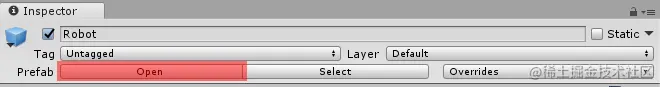 - 同样是在 Hierarchy 面板选中 Prefab 后,在 Inspector 面板最上方会显示