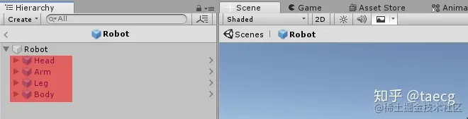 - 首先在 Hierarchy 面板中创建出我们的机器人,并且把所有的部件都放在一个叫