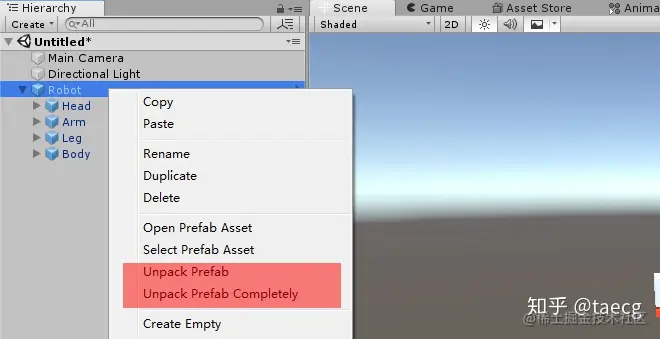 同样,新功能,其实 Prefab 确实很像一个组,组内包含各式各样的部件与组件,那既然是一个组,那就有解散组的可能性。