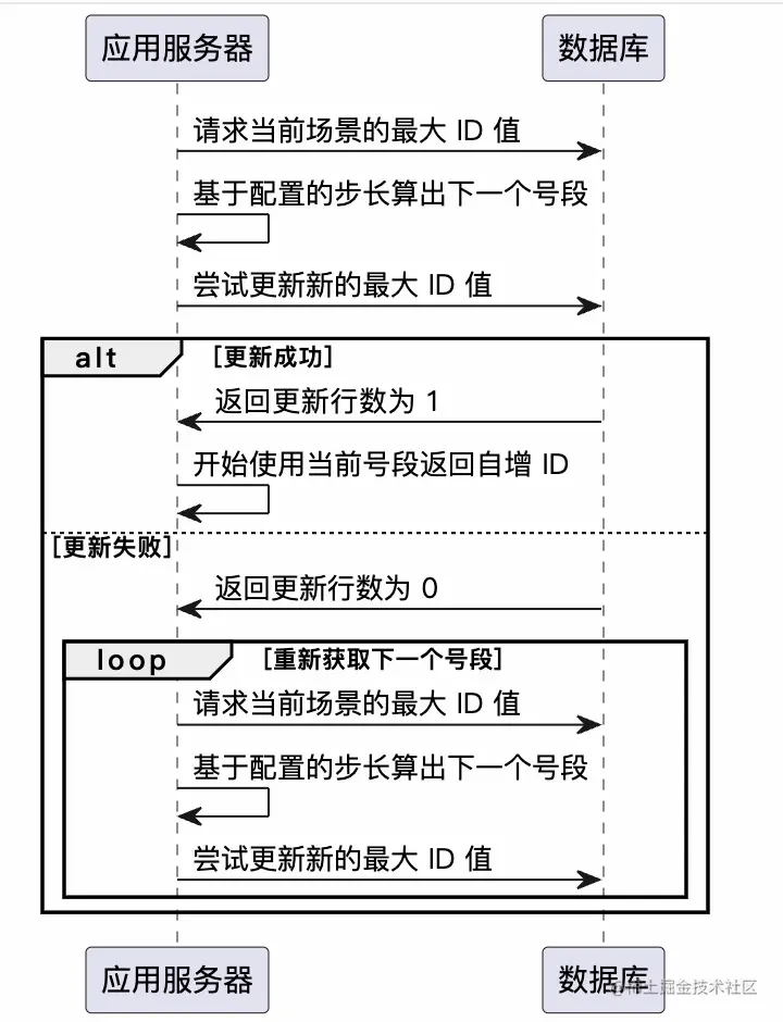 但如果自增是在内存中执行的,是否会存在多台机器申请到同一 “号段” 导致出现重复 ID 呢?这个部分是通过在请求数据库阶段的乐观锁实现的,因为当前机器确定使用这个号段前,会更新数据库当前最大 ID 值,通过乐观锁机制,如果拿老的最大 ID 值更新没有成功,意味着需要再去尝试取下一个 “号段”,直到成功更新数据库记录为止。这个过程的时序如下: