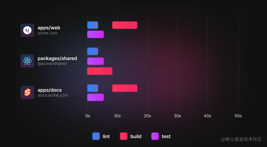 Turborepo提供了一种声明式的方法来指定各个任务之间的关系,这种方式能够更容易理解各个任务之间的关系,并且Turborepo也能通过这种显式的声明来优化任务的执行并充分调度CPU的多核心性能。