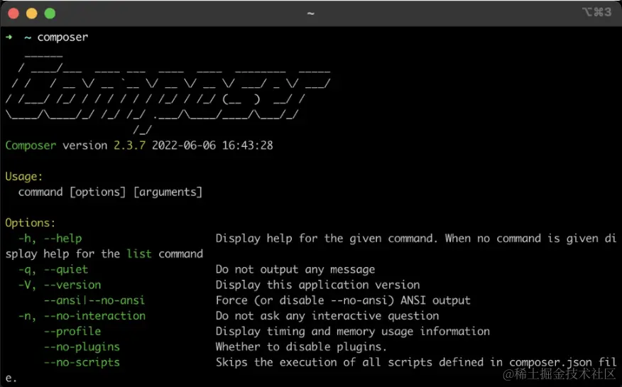 Composer类似NodeJS的 NPM,和大部分的一站式依赖管理是类似的。Composer安装之后的页面内容如下: