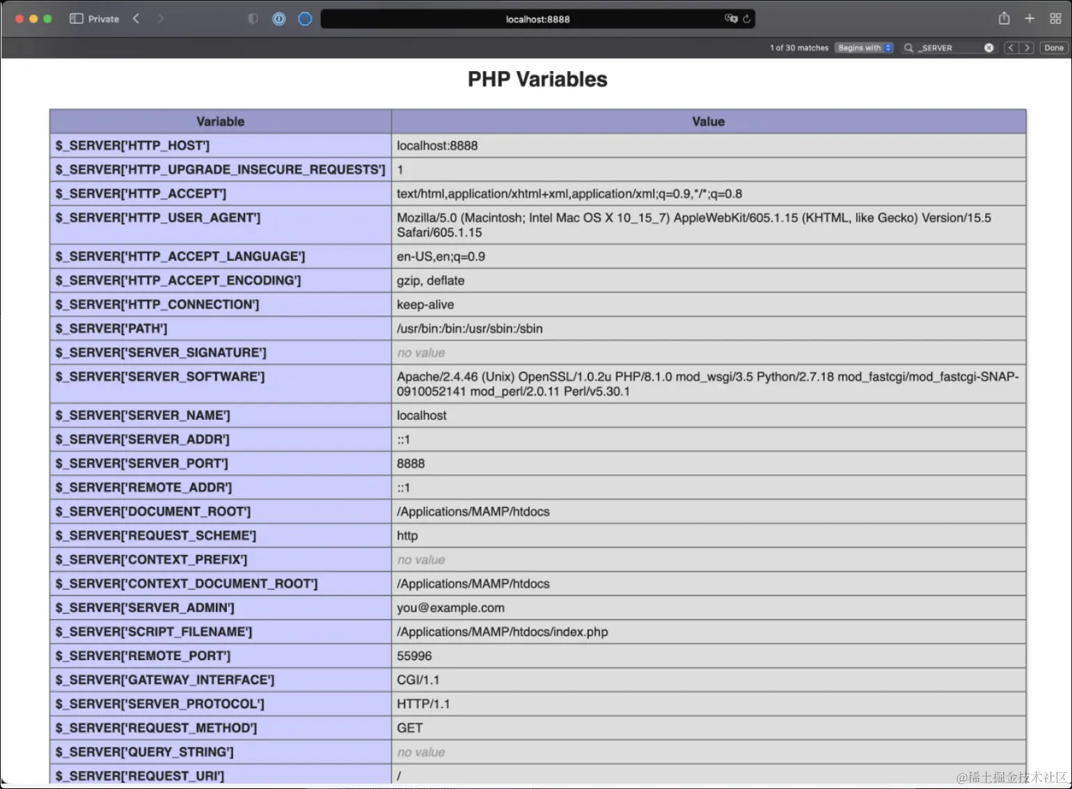 $_SERVER 包含了许多非常有用的服务器信息,我们可以使用Phpinfo方法获取服务器内容: