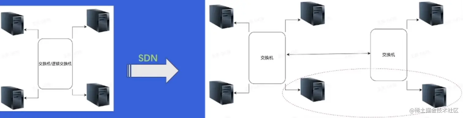 我们可以通过sdn的软件虚拟化技术实现,如图右边看到两个虚拟机,其实是通过虚拟化技术实现在同个网段。所以网段不一定是同一个物理交换机的