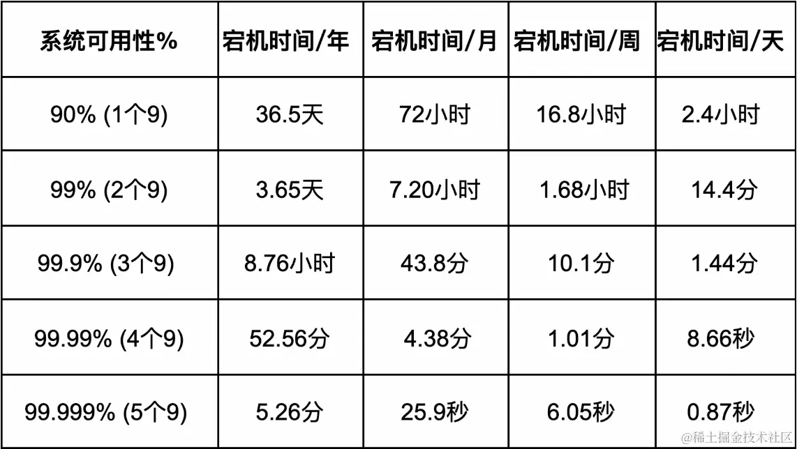 另外,我们常说的几个9,即从上面公式演化而来,便于商业化沟通。对几个9的可用性整理如下: