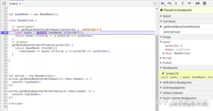 原生支持意味着不需要编译代码。更重要的是,它调试起来很方便。在函数入口设置断点并执行跳过 await 行之后,调试器会在 bookModel.fetchAll() 执行时暂停一会儿,然后移动到下一行(也就是.filter)!这比使用 promise 要容易调试得多,因为你必须在.filter 这一行设置另一个断点。
