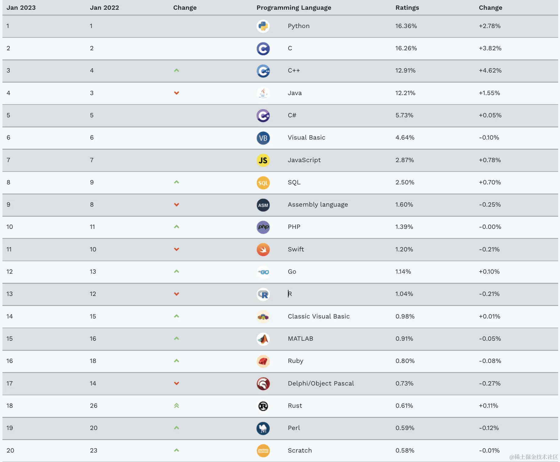 TIOBE 排行榜每月更新一次,你可以在www.tiobe.com/tiobe-index… 查看编程语言的最新排名。
