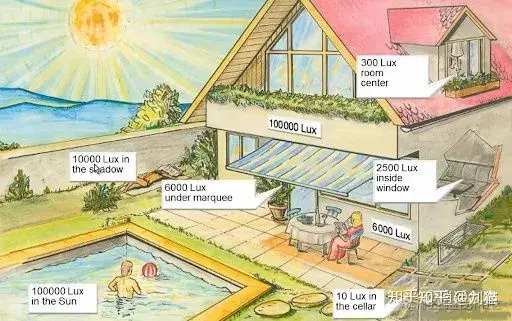 这是一个简单示意图,可以看到在室内一般是 300 lux 左右的光照强度。
