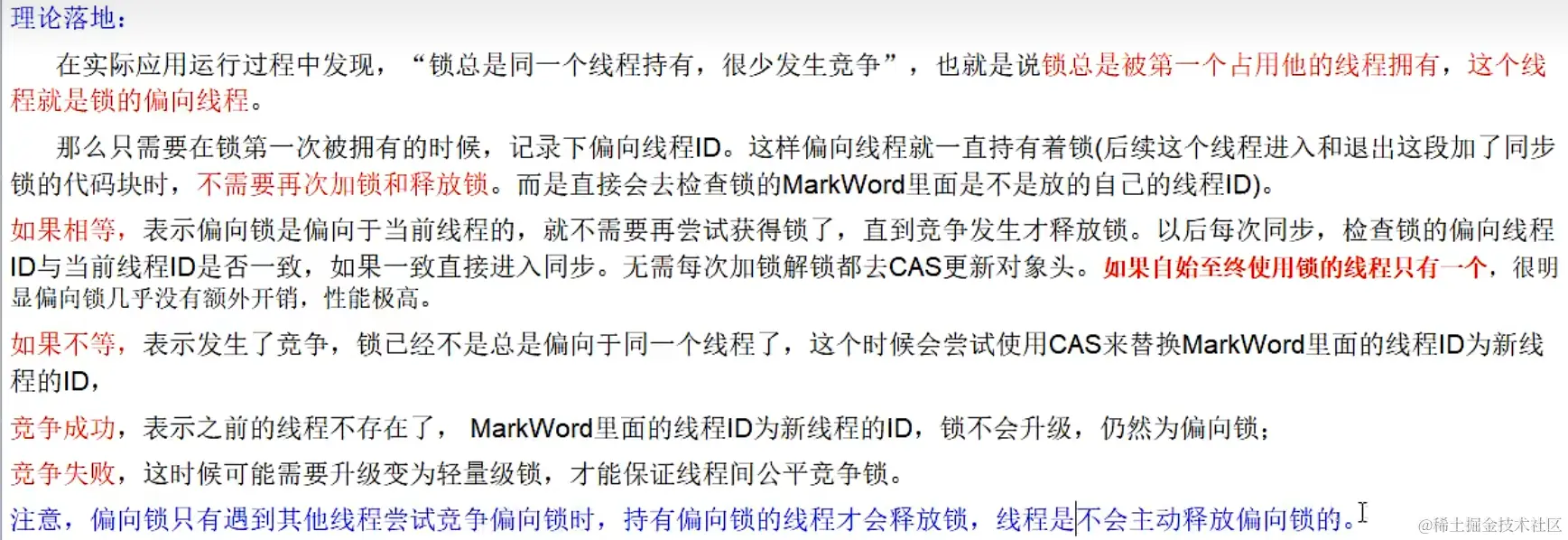 修改记录线程信息,只有一个线程没有其他线程竞争,就不用上锁会自动获得锁。偏向于第一个访问的线程(偏向线程)。我们记录偏向线程ID,以后就检查是否记录的线程ID,不用再上锁。如果ID匹配不同发生竞争,竞争成功。那么就会用CAS来交换markword的ID位新ID。竞争失败就升级位轻量级锁,保证公平性。