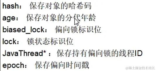包含哈希码,GC标记,GC次数,同步锁标记,偏向锁持有者。