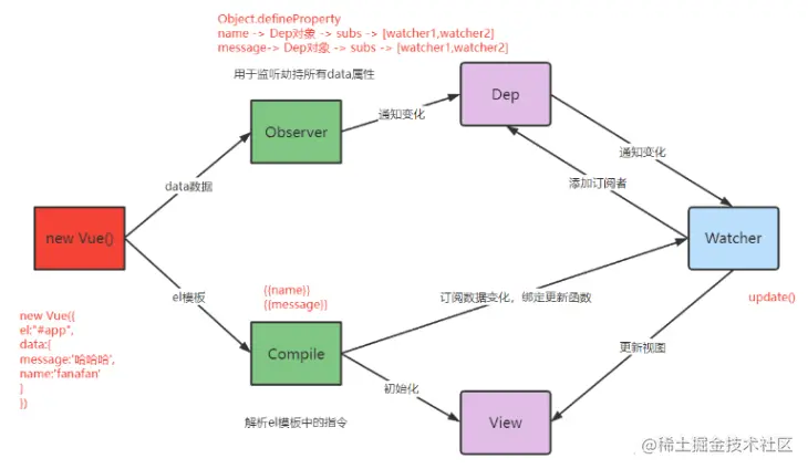 - 同时定义一个更新函数 update()和 Watcher,将来对应数据变化时 Watcher 会调用更新函数。