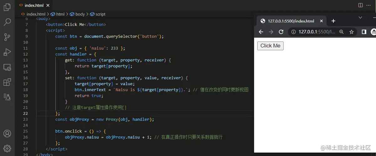 btn.innerText = `Naisu is ${target[property]}.`; // 值在改变的同时更新视图
