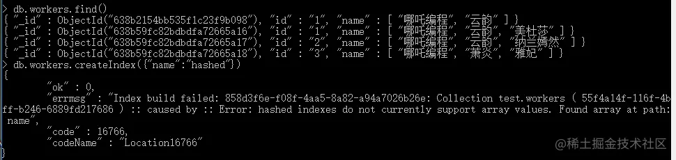 比如上图的异常,片键不能是数组,大多数特殊类型的索引不能用作片键。特别是,不能在地理空间索引上进行分片。