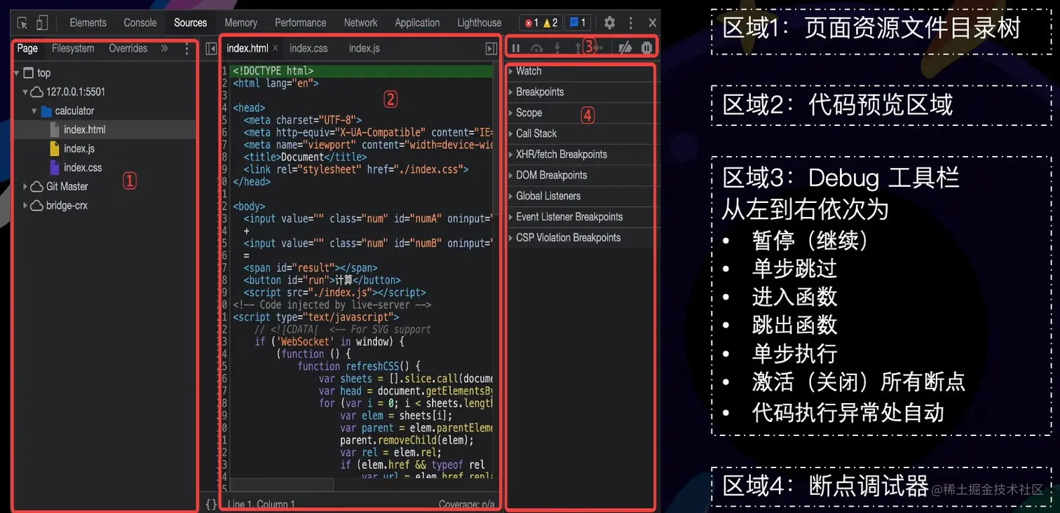- 使用关键字debugger或代码预览区域的行号设置断点