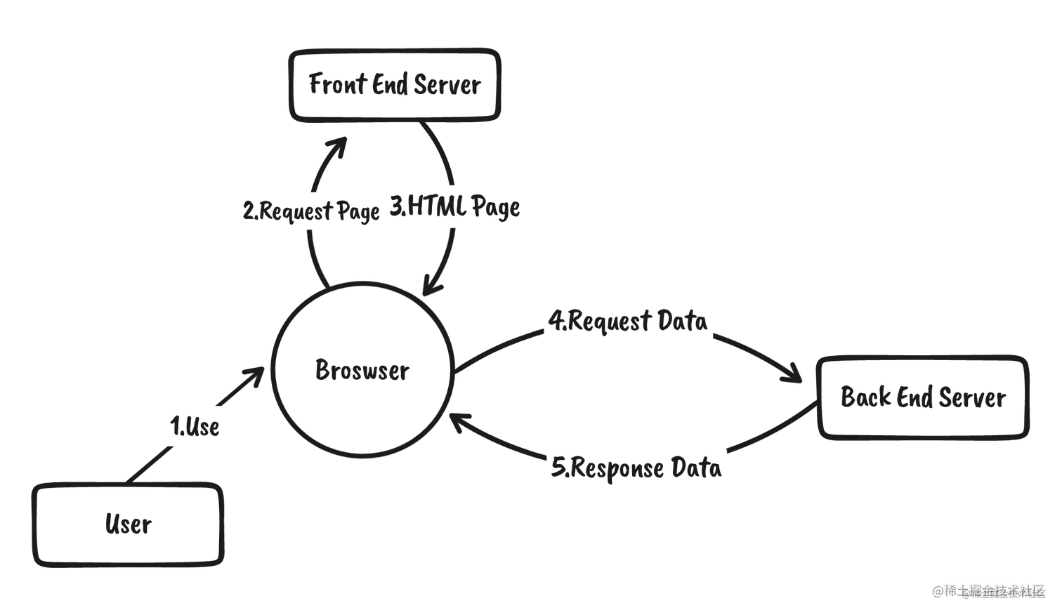 现在大部分的项目都是这种模式,这也是传统意义上的SPA应用的工作模式。在这种渲染模式下可以做到完全的前后端分离,前端开发完成直接将模板和相关 JS、CSS 资源上传 CDN 即可,这种场景下的页面托管只需要返回一个空白页,然后通过 CDN 获取相应的资源文件,完成页面渲染 。不过这也会带来几个老生常谈的问题: