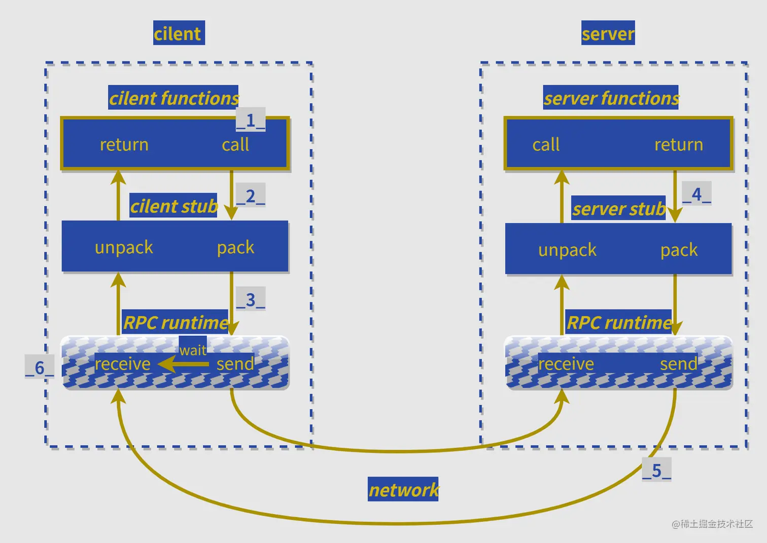 客户端调用远程过程,将参数和附加信息序列化为消息,并将消息发送到服务器。收到消息后,服务器反序列化其内容,执行请求的操作,并将结果发送回客户端。
