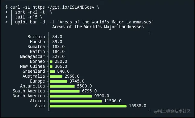 29、YouPlot:Ruby 写的命令行数据可视化工具。该项目能够在终端里将数据转化成彩色的图表,支持条形图、直方图、箱型图等类型的图表。