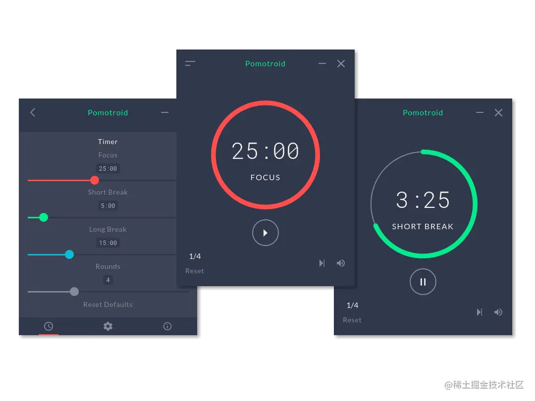 21、pomotroid:视觉上令人愉悦的番茄时钟。这是一款 Vue 写的拥有超高颜值的番茄计时器,支持自定义时间、回合数、提示音、桌面通知等功能。