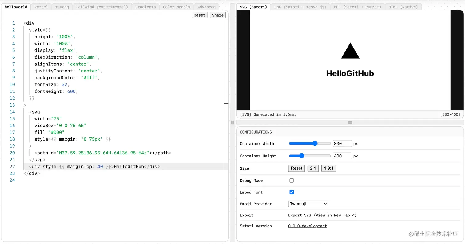 22、satori:能够将 HTML 和 CSS 转换为 SVG 的库。由 Vercel 团队开源的可根据 HTML 和 CSS 代码生成 SVG 图像的库。支持 JSX 语法,使用起来十分方便和顺手。