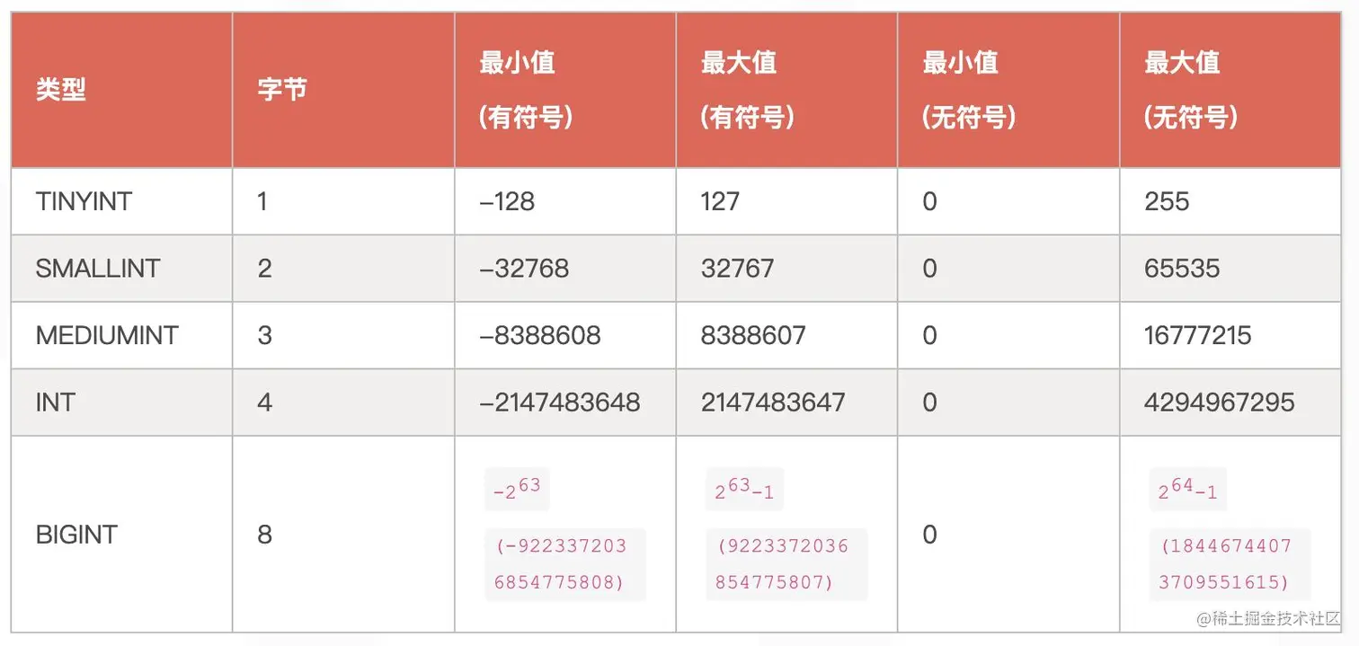 从上图可以看出,tinyint和smallint的范围都比较小,我们一般不会将其作为主键id的类型。