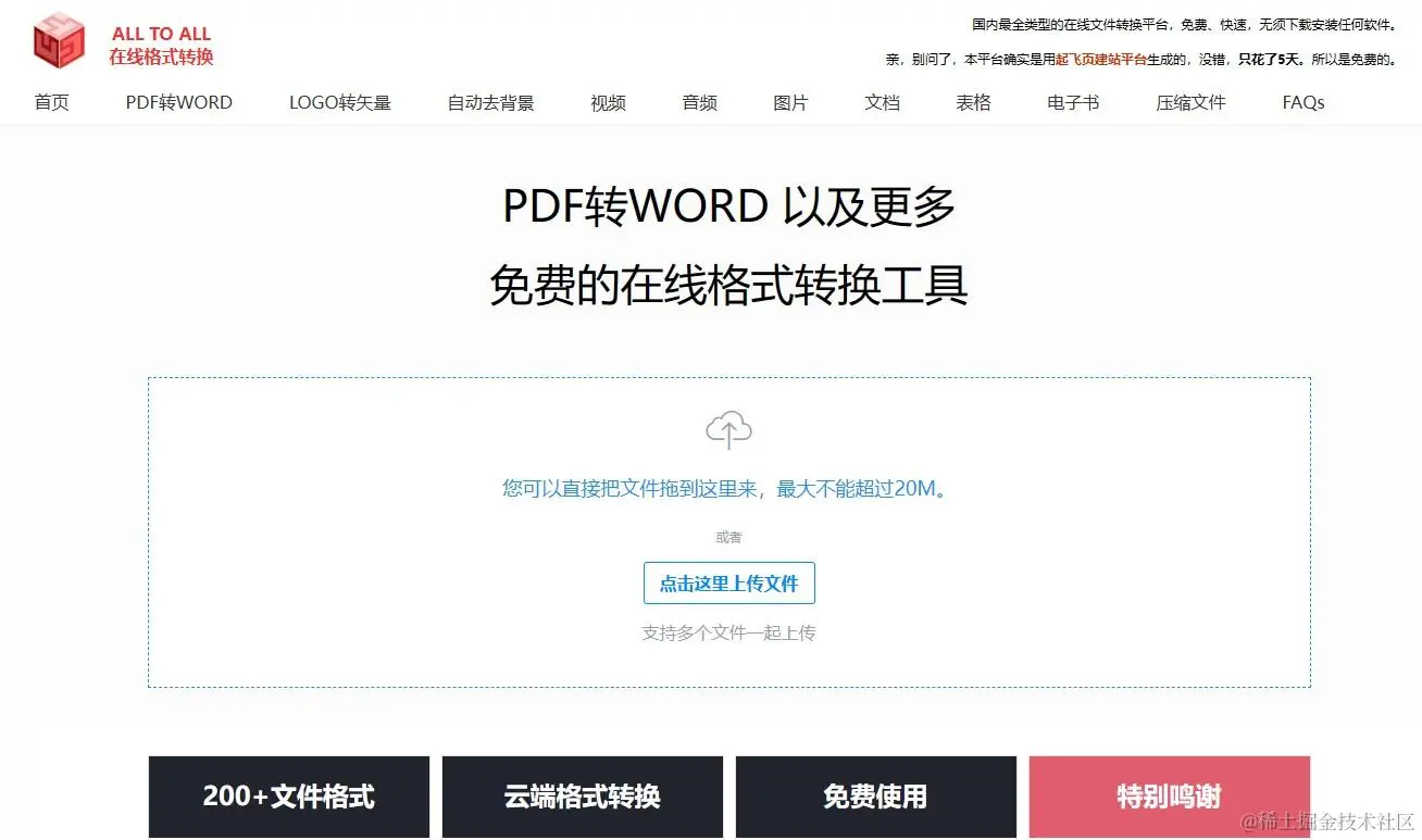 ALL TO ALL是一个免费在线格式转换工具,支持文档、电子书、图片、视频、音频等多种类型文件不同格式之间的互相转换。并且转换的速度也是比较快,当然,最关键的还是免费。日常运动一些文件需要转换格式,有了它也就免去了下载软件安装的烦恼了。