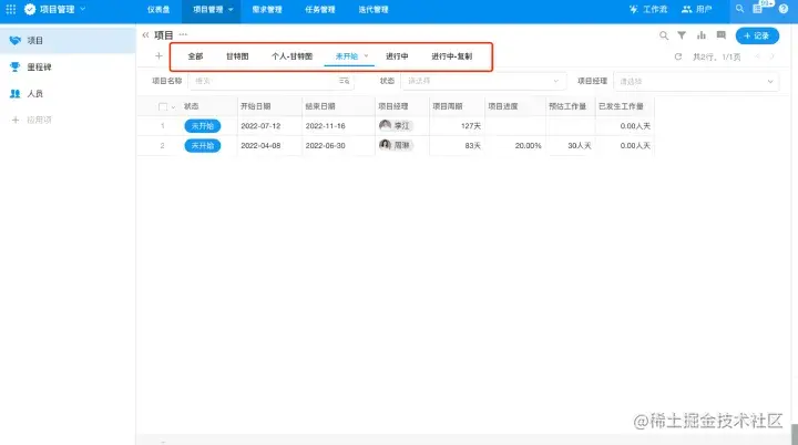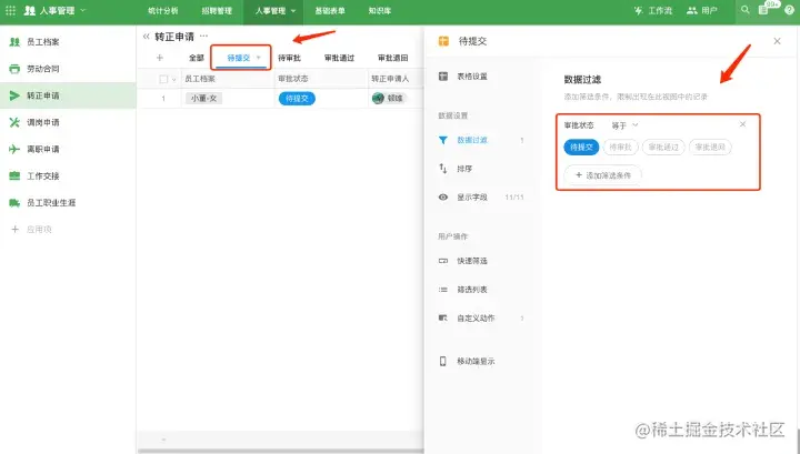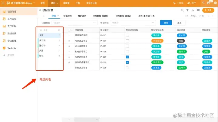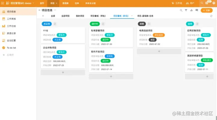 根据字段状态、时间、阶段,不同的视图设置不同的筛选条件。比如:审批表单,可以按照审批状态来配置不同的视图组合,待提交、待审批、审批通过、审批退回。项目表单,可以按照项目的阶段来配置视图组合,未立项、进行中、已结项、已归档、搁置等状态;也可以按照用户权限来配置组合,全部的、我的、我和下属的。