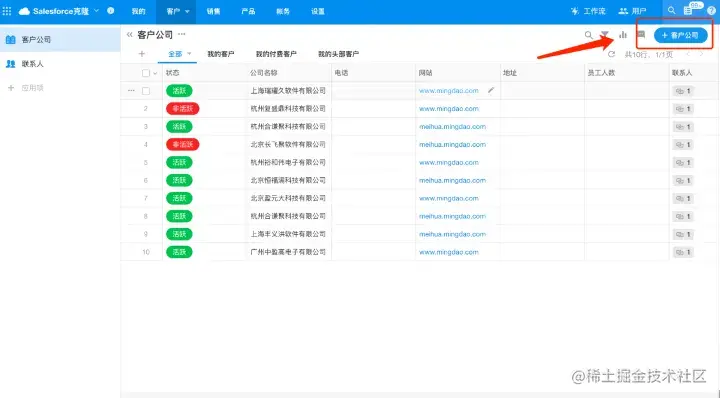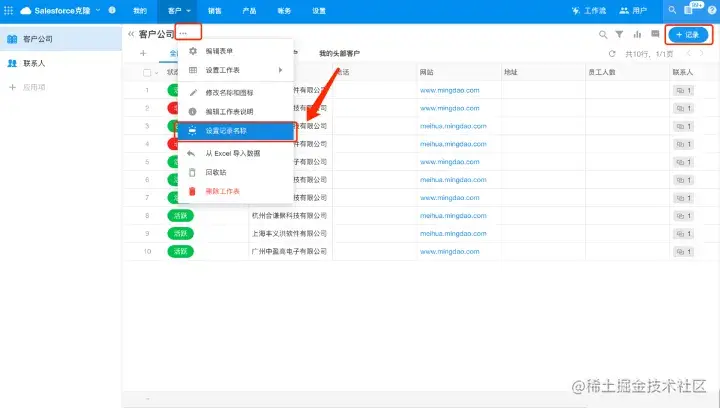 比如客户表,记录名称可修改为“客户公司”,联系人表的记录名称可修改为“联系人”,这样添加记录时,看到的是“+客户公司”、“+联系人”,而不是“+记录”。