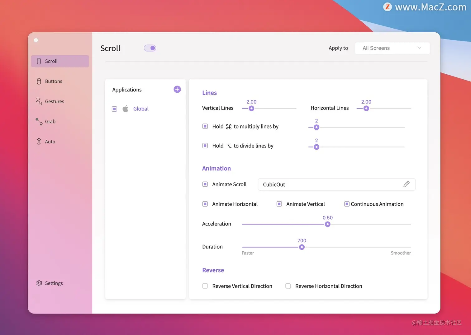 Smooze Pro Mac帮助您的鼠标平滑滚动,以及向任何应用程序添加自定义鼠标按钮操作和鼠标手势。功能强大,操作简单。