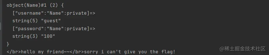看源码我们需要password=100,username=admin,但反序列化过程中wakeup方法里会把username赋值为guest;