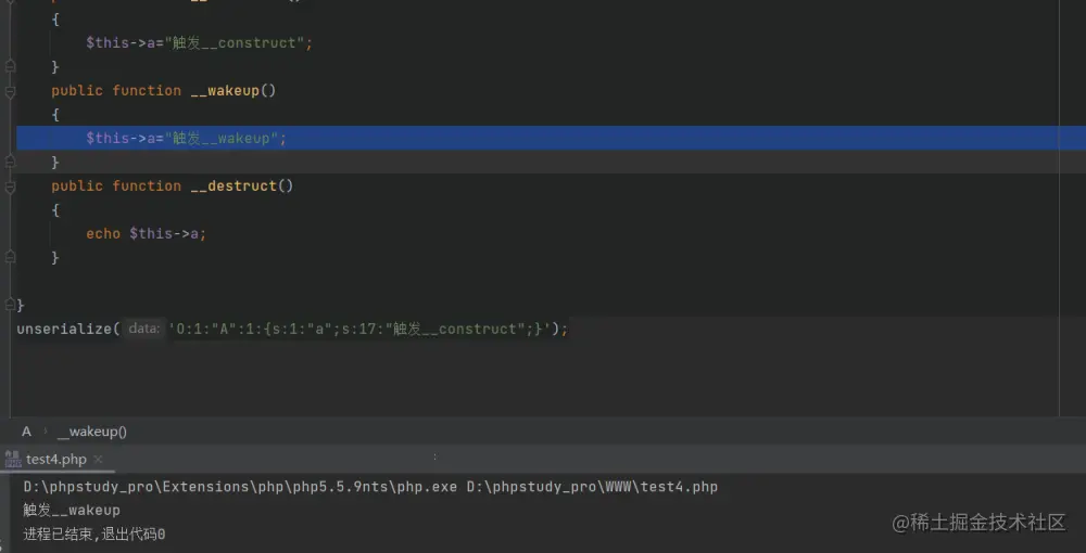<?php class A{ public $a; public function __construct() { $this->a="触发__construct"; } public function __wakeup() { $this->a="触发__wakeup"; } public function __destruct() { echo $this->a; } } $a=new A(); echo serialize($a);