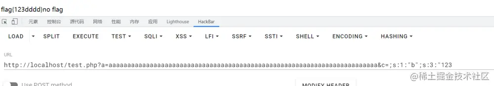 这里测试一下,很明显可以看见4个aaaa 变成了两个b,但s:4依然是四个字符串,a的值就相当于是从aaaa变成了bb";这样,相当于往后吞噬掉了两位,而这个题需要$b为123才能给flag,