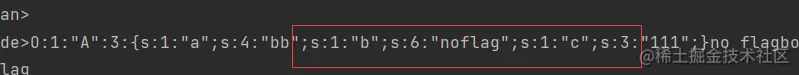 $b=serialize($a); echo $b; $c=str_replace("aa","b",$b); echo($c); //O:1:"A":3:{s:1:"a";s:4:"aaaa";s:1:"b";s:6:"noflag";s:1:"c";s:2:"11";} //O:1:"A":3:{s:1:"a";s:4:"bb";s:1:"b";s:6:"noflag";s:1:"c";s:2:"11";}