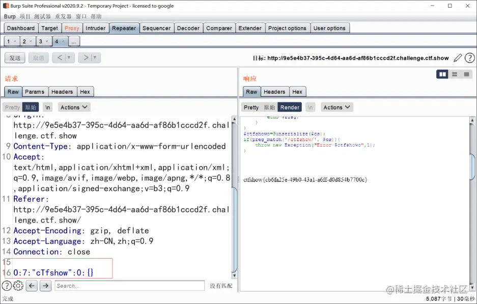 很明显是触发析构函数就得到了flag,但是有过滤,如果匹配到了ctfshow就抛异常,