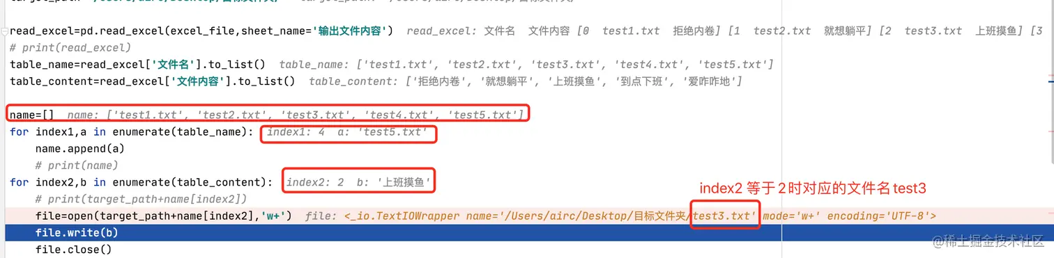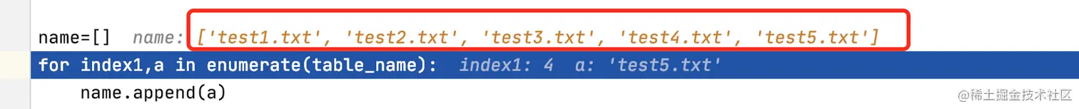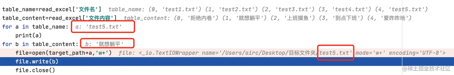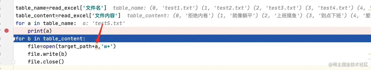 而究竟a的结果为什么只有test5.txt的内容呢?咱再看下第一个for 循环最后给a传的值究竟是什么,当把断点放在print(a)的位置,当一个for 循环遍历完毕时看到最后打印出是‘test5.txt’。