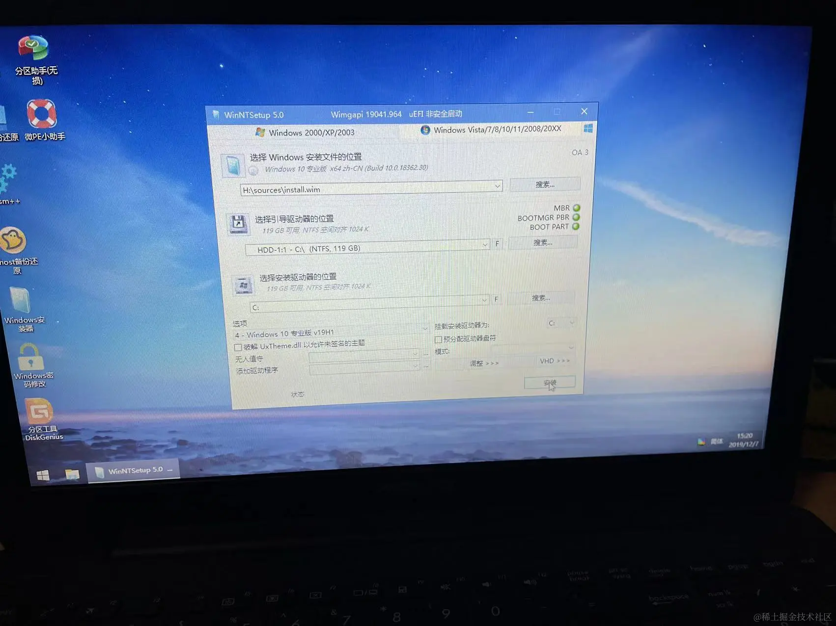第四步,进行系统安装。我们打开”WinNTSetup5.0"软件,在“选择Windows安装文件的位置”,选择下载好的win10系统副本。