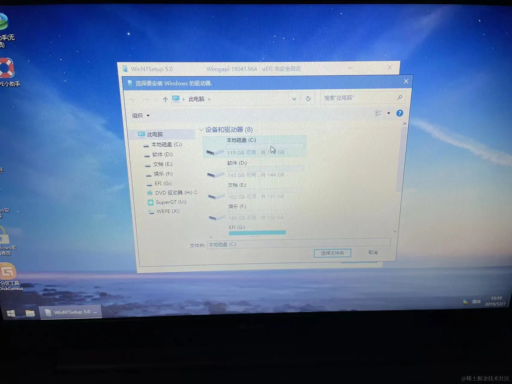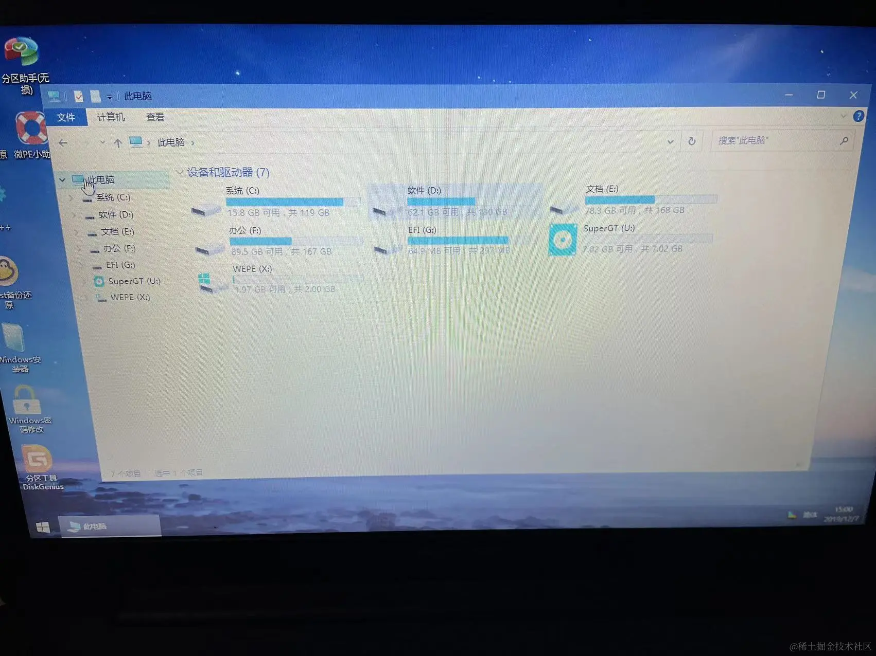 简单地介绍下,笔者这里的C盘是固态硬盘,把系统装到这个盘运行会快一点流畅一点,D、E、F为笔者另一个磁盘分区出的三个盘,其它的是这个启动U盘整出来的。