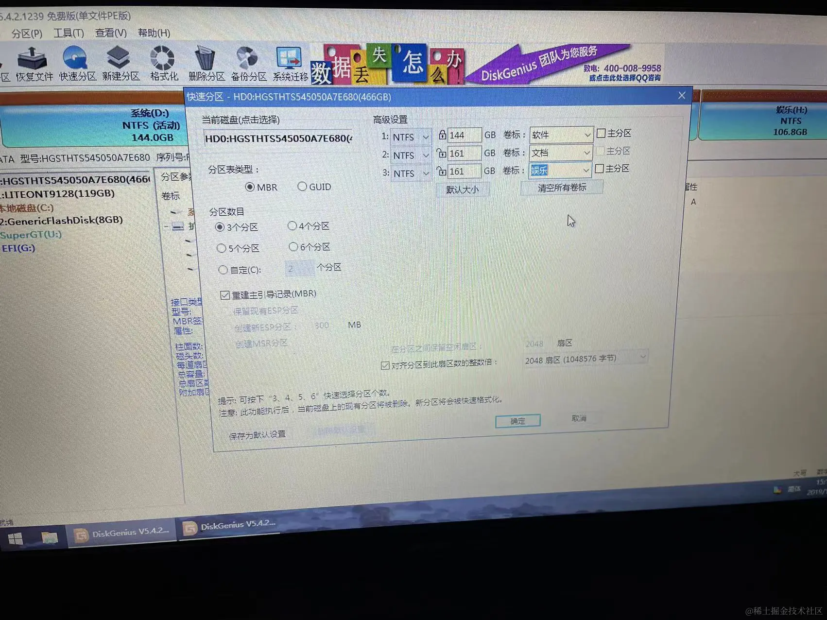 分区表类型选择MBR并重建主引导记录(MBR)、分区看磁盘情况,我这边分三个就够了,一个软件,一个文档,一个娱乐。最后点击”确定“。