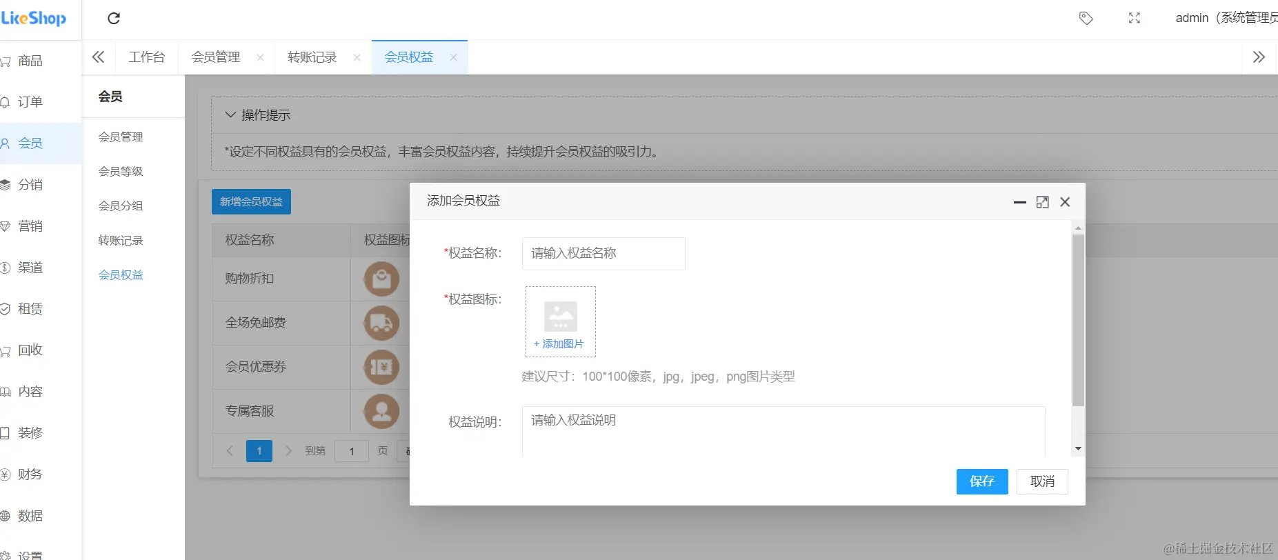 会员权益—新增会员权益,输入权益名称,权益图标,权益说明,如下图所示: