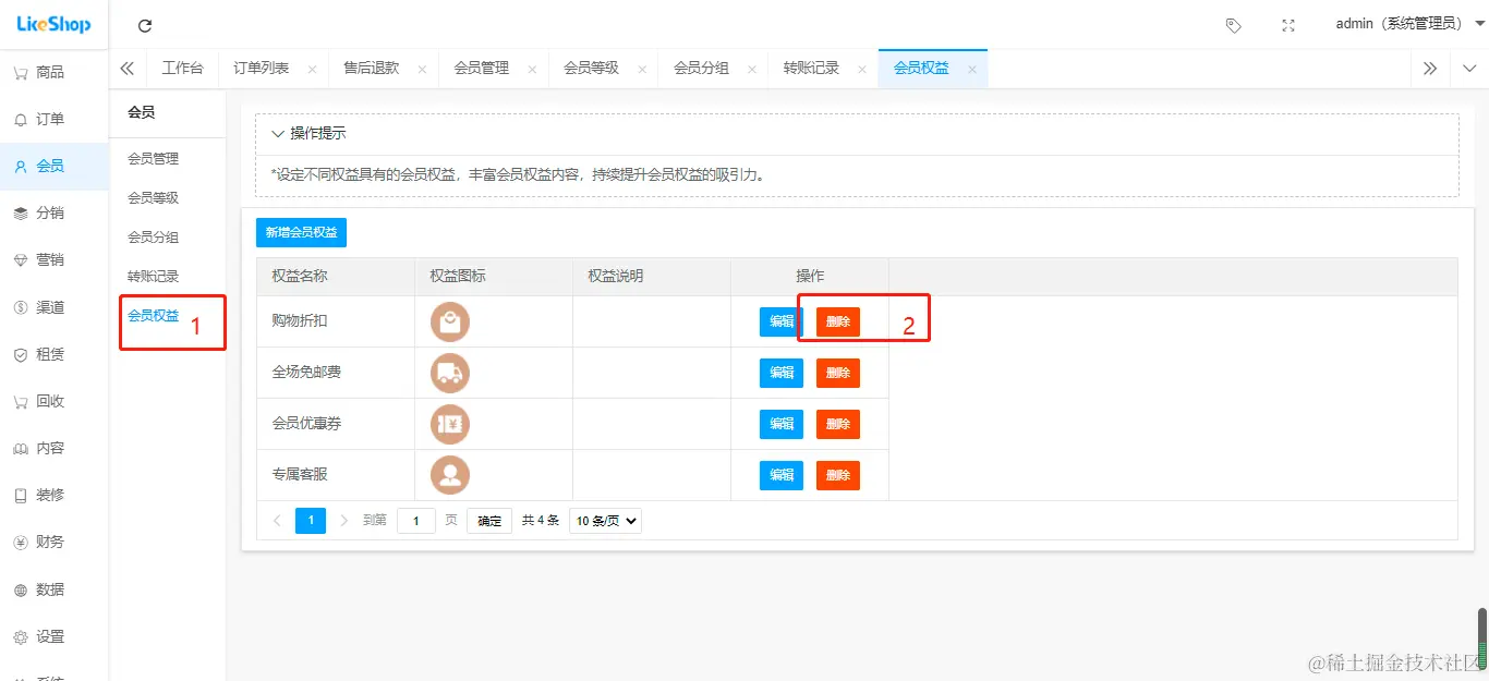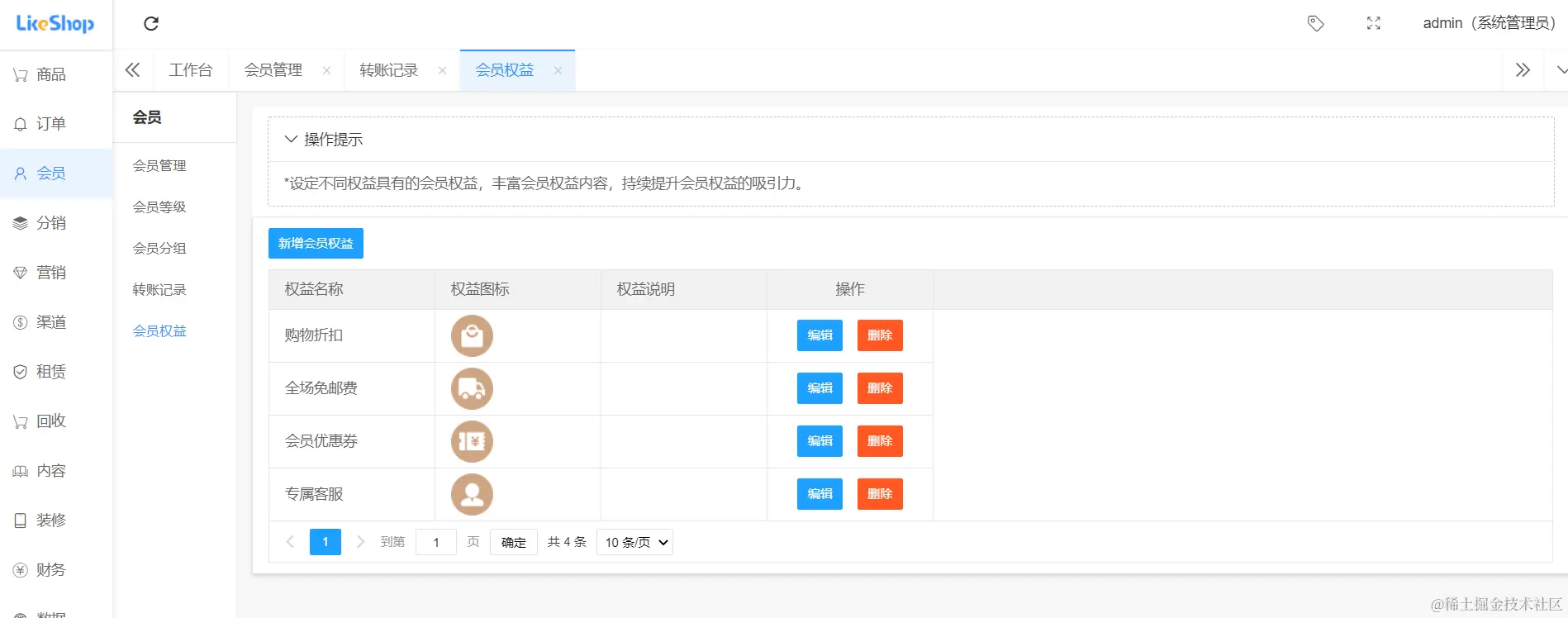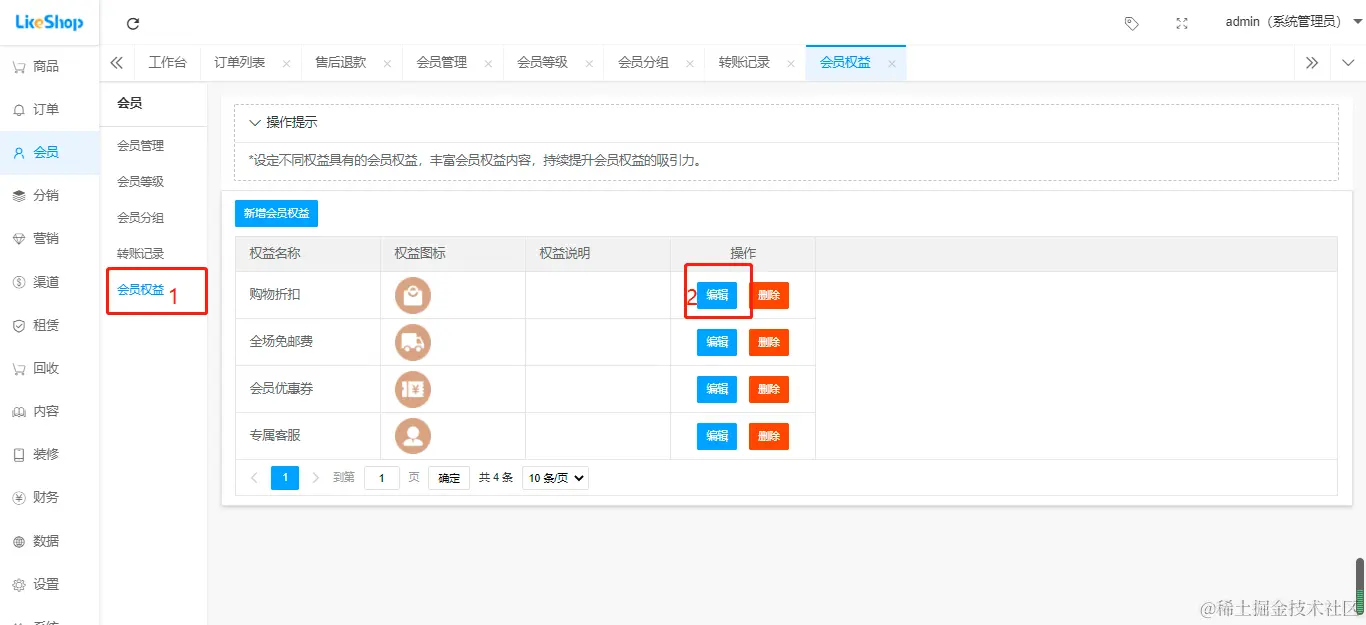 店铺可以编辑/删除会员权限,如下图所示: