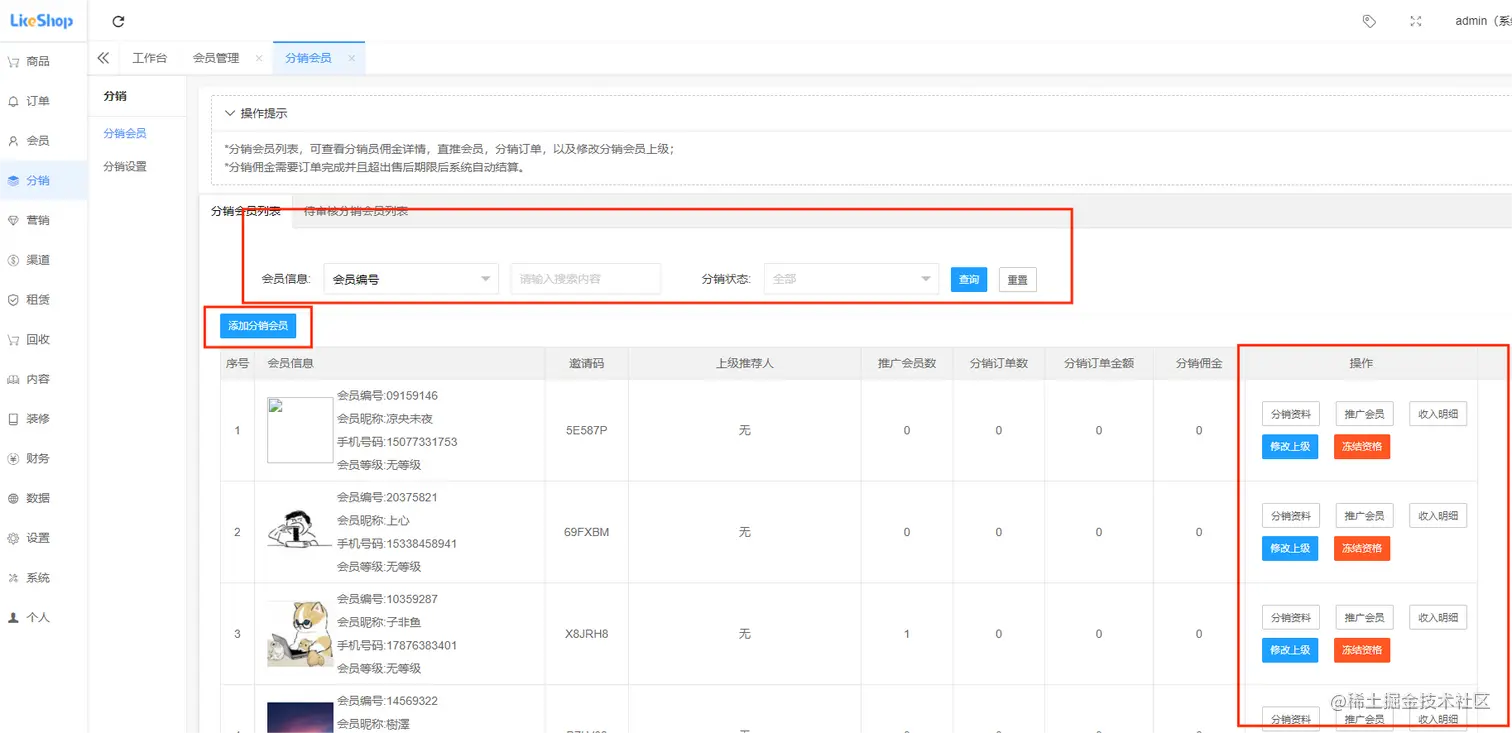 平台管理可以通过选择会员信息(会员编号、会员昵称、手机号码),选择分销状态(全部、未冻结、已冻结)来查询分销会员