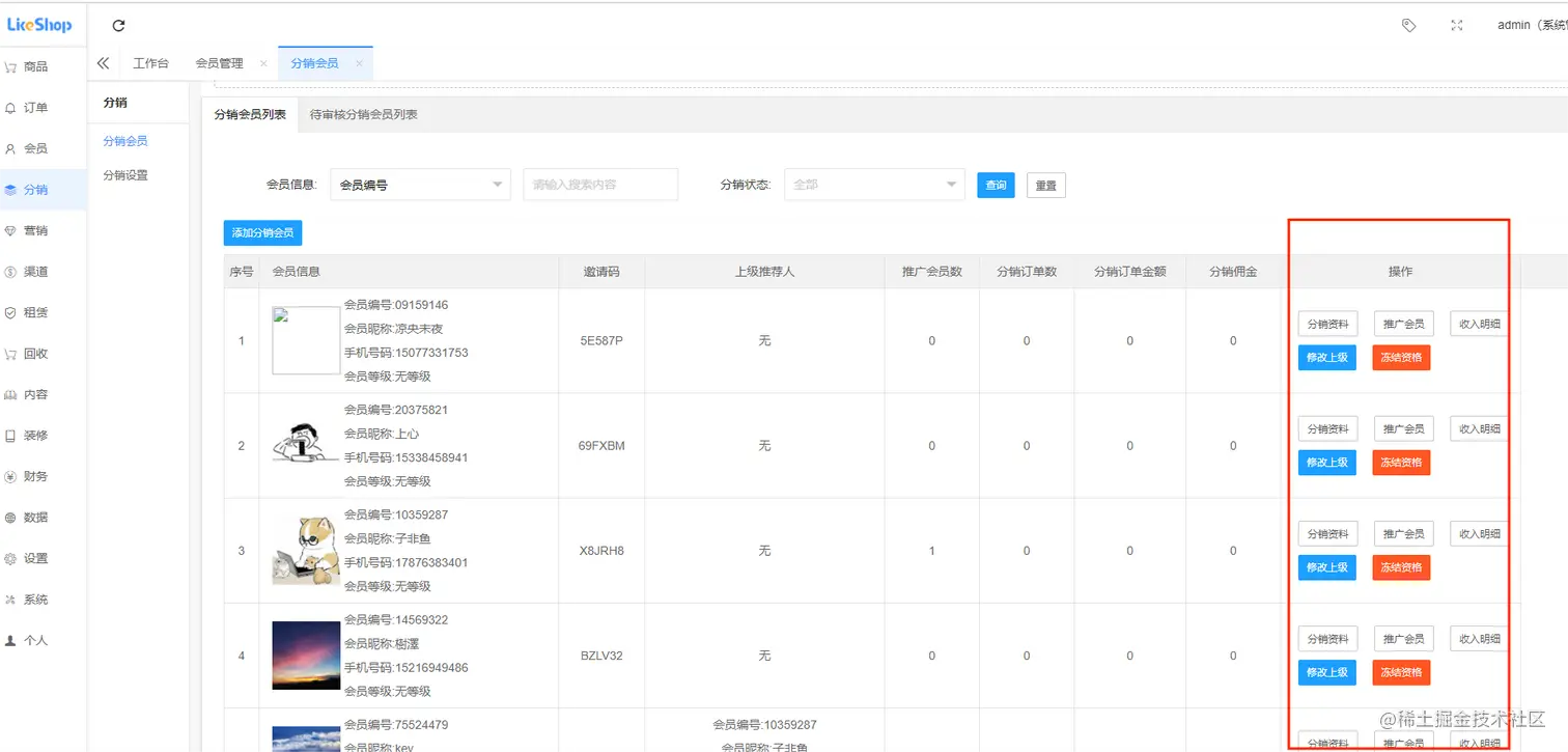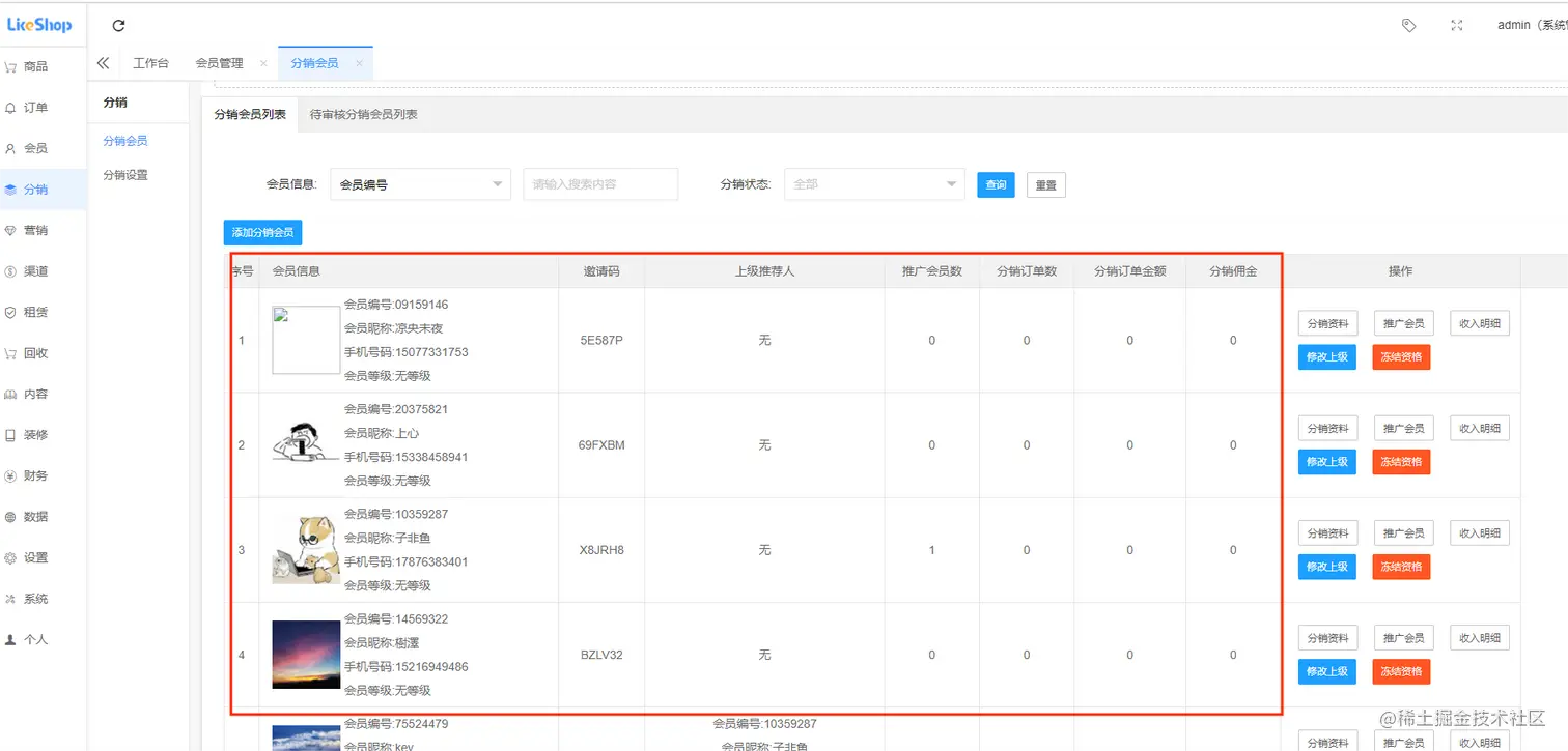 分销会员列表,可查看分销员佣金详情,直推会员,分销订单,以及修改分销会员上级,如下图所示: