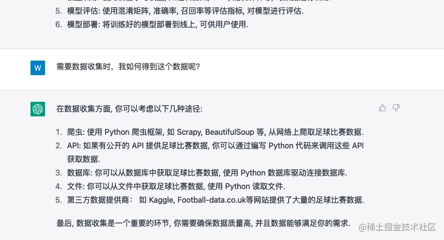 现在你可以开始跟它对话来进一步深入获取需要的信息。 例如,ChatGPT 将我的项目分成6个section,并在第一个section里建议进行数据收集,那么我可以接着问: