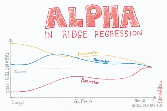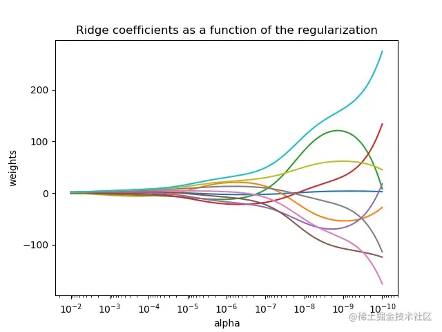 岭回归通过对系数的大小施加惩罚来解决普通最小二乘法的一些问题。 ridge coefficients ( 岭系数 ) 最小化一个带罚项的残差平方和: