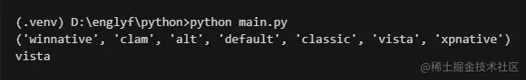 上面代码调用 Style 类实例的 theme_names() 返回 tkinter 支持的所有主题类型('winnative', 'clam', 'alt', 'default', 'classic', 'vista', 'xpnative')。