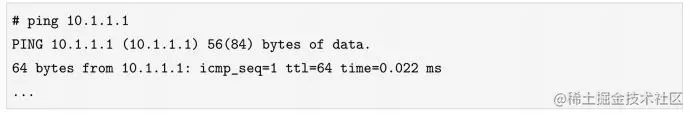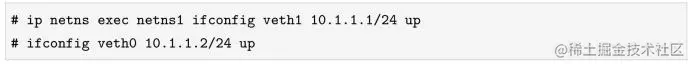 上面两条命令首先进入netns1这个network namespace,为veth1绑定IP地址10.1.1.1/24,并把网卡的状态设置成UP,而仍在主机根network namespace中的网卡veth0被我们绑定了IP地址10.1.1.2/24。这样一来,我们就可以ping通veth pair的任意一头了。